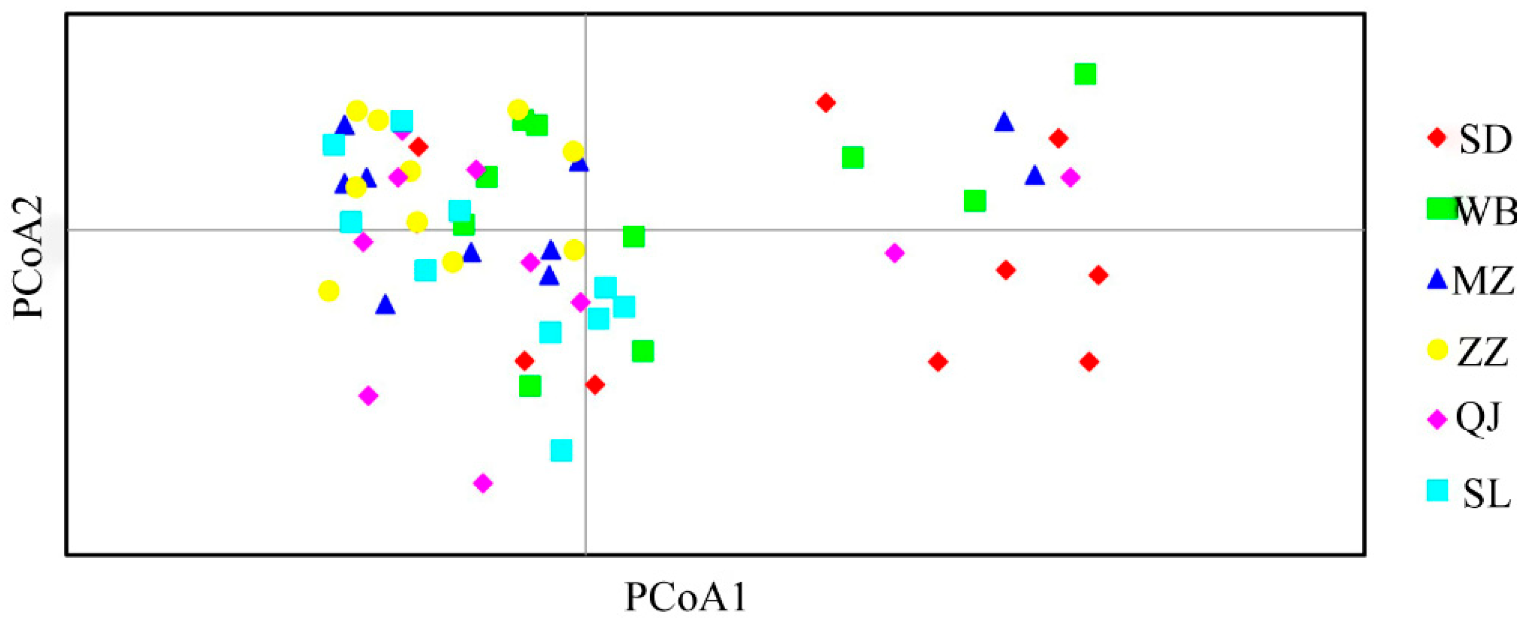 A two-dimensional principal coordinate analysis (PCoA) scatter plot was generated to assess the genetic relationships among populations (