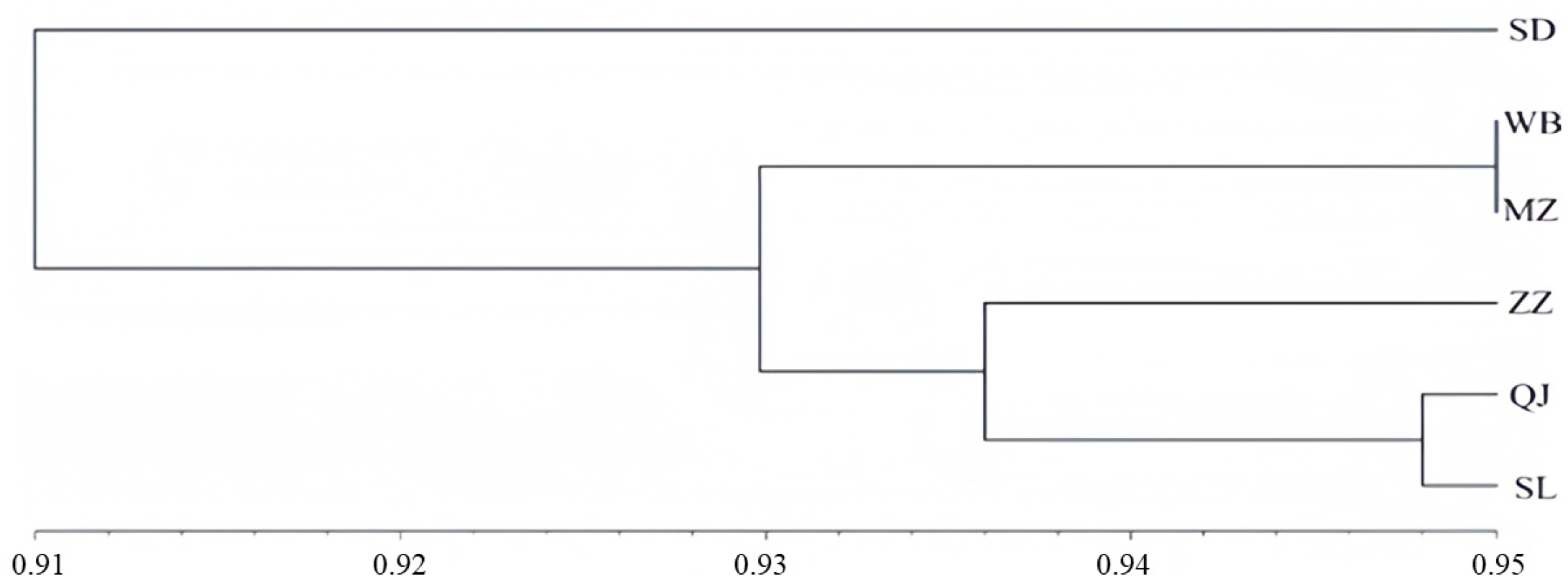 Cluster analysis of the six sampling sites was performed using genetic similarity coefficients, and the grouping results are shown in