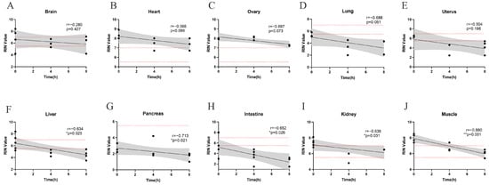 Linear regression lines for each tissue between RIN value and post-collection intervals with 95% confidence limits. The distribution of samples with significant correlations ((F–J) liver, pancreas, intestine, kidney and muscle) compared to those with no correlation ((A–E) brain, heart, ovary, lung, and uterus) is shown. The dash lines indicated the RIN cutoffs of 5.5 and 7, reflecting the requirements of most downstream applications. The statistical relationships between RIN value and post-collection intervals were assessed using Spearman’s rank correlation coefficient, with p < 0.05 considered statistically significant. (*, p < 0.05; **, p < 0.01).