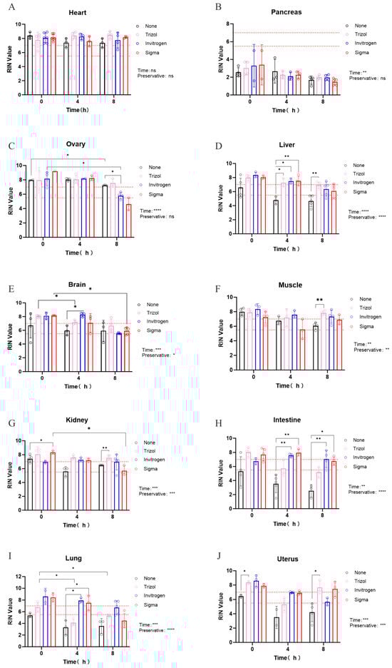 The protection effect of different RNA preservatives (None, TRIzol, Invitrogen RNAlater, Sigma RNAlater) on the RIN values from ten mouse tissues. (A) Heart (p-values for time and preservative: 0.700, 0.395), (B) Pancreas (p-values for time and preservative: 0.006, 0.975), (C) Ovary (p-values for time and preservative: <0.0001, 0.470), (D) liver (p-values for time and preservative: <0.0001, <0.0001), (E) Brain (p-values for time and preservative: 0.003, 0.042), (F) Muscle (p-values for time and preservative: 0.0028, 0.0029), (G) Kidney (p-values for time and preservative: 0.001, 0.0007), (H) Intestine (p-values for time and preservative: 0.0034, <0.0001), (I) Lung (p-values for time and preservative: 0.0034, <0.0001), (J) Uterus (p-values for time and preservative: 0.0003, 0.0002). The dash lines indicated the RIN cutoffs of 5.5 and 7, reflecting the requirements of most downstream applications. Data are presented as means ± SEM (*, p < 0.05; **, p < 0.01; ***, p < 0.001, ****, p < 0.0001).
