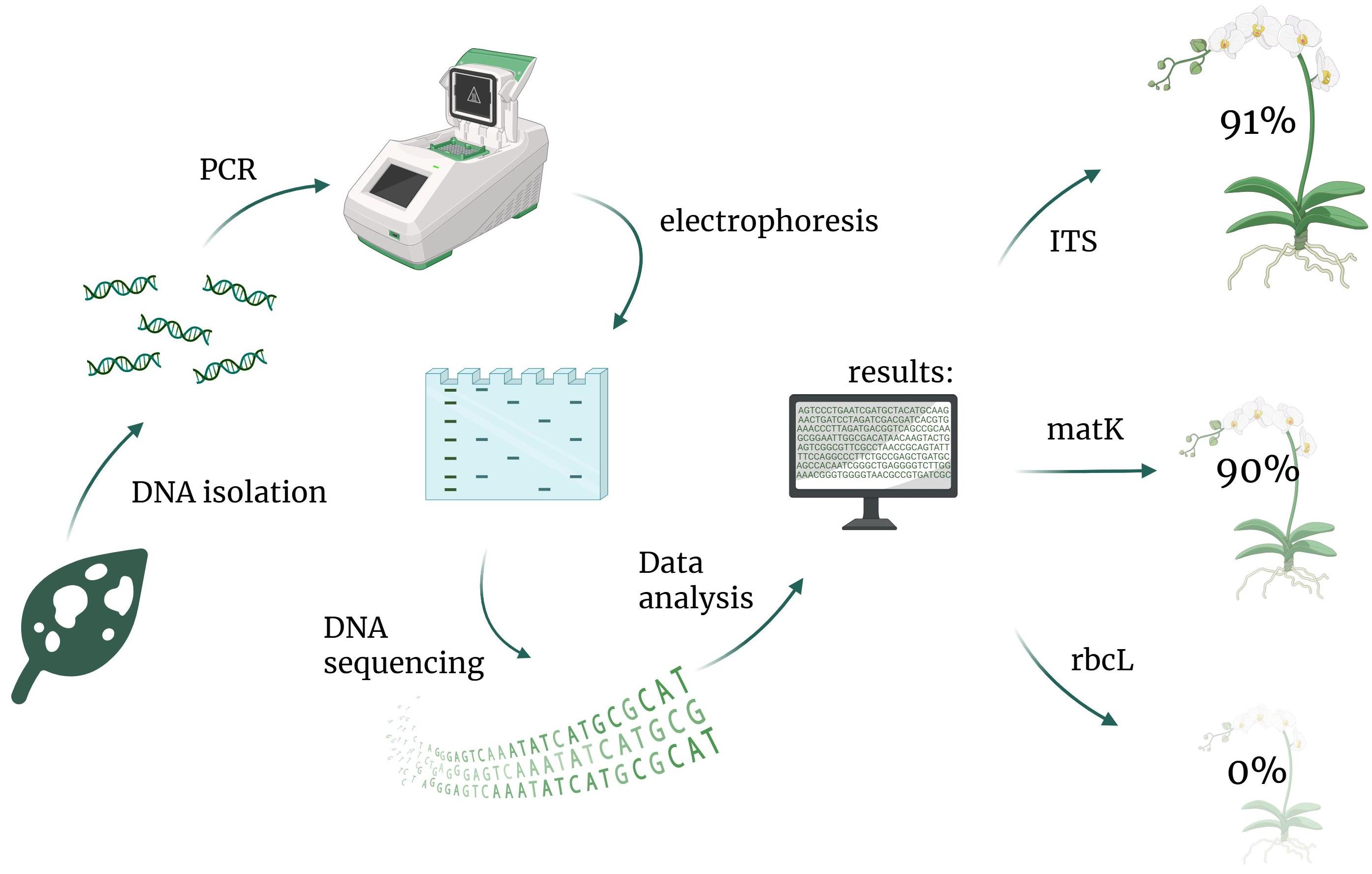 | matK | Temperature [°C] Time Number of cycles | 94 4 min 1× | 94 1 min 32× | 48 40 s 32× | 72 50 s 32× | 72 7 min 1× |