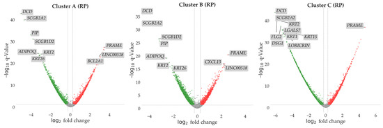 In the volcano plot we report all the genes explored in the DEA for each cluster vs. control comparison performed with the Rank Product (RP) approach. Sample sizes were 51 for Cluster A, 52 for Cluster B, 59 for Cluster C, and 20 for controls. On the y-axis we report the log10 value of the adjusted p-value. The dashed line shows the significance threshold of p = 0.05. All the genes above this line are considered differentially expressed. On the x-axis we report the log2 fold change. The dashed lines show the fold change thresholds (fold change > |0.5|) used in the analysis. Up- and downregulated DEGs are reported in red and green, respectively. Genes not significantly dysregulated are reported in grey. Top 10 DEGs by significance are labeled in the plots for each comparison.