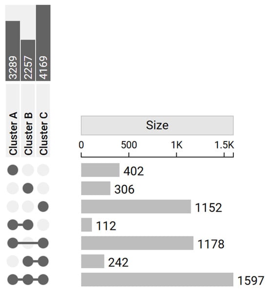 Upset plot reports the number of DEGs in each cluster (dark gray in the upper left corner) and their intersections (light gray in the right-hand side of the plot). The matrix layout on the left displays the combinations of sets involved in each intersection: filled dots connected by lines represent the specific clusters’ intersections, while unconnected or empty dots indicate absence from a given cluster. On the right, bars quantify the number of elements belonging to each intersection. Specific DEGs were 402 for Cluster A, 306 for Cluster B, and 1152 for Cluster C.