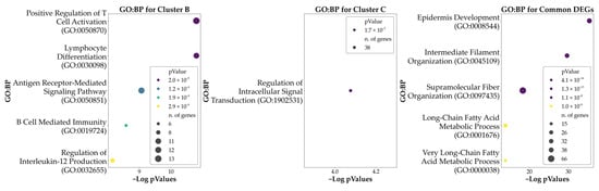 Bubble plots of the top five significant Gene Ontology: Biological Processes (GO: BP) associated with each cluster and with the genes found to be DEGs in all the clusters. Cluster A is not represented here as no significant GO: BP resulted from the ORA. Hue reports the p-values of the analysis, while the size of each bubble indicates the number of DEGs being part of each process.