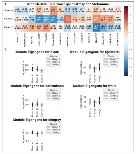 The WGCNA revealed that epidermal and differentiation-related pathways are associated with the “Black” module, which is upregulated in Cluster B and downregulated in Cluster C. Although these processes appeared dysregulated across all melanoma subtypes, their specific modulation within the “Black” module highlights subtype-dependent differences. The upregulation of this module in Cluster B suggests a more aggressive phenotype, characterized by enhanced activation of epidermal pro-tumoral signaling and stronger epithelial–melanocyte interactions that may promote invasion, metastasis, and therapeutic resistance. Conversely, the downregulation observed in Cluster C indicates a subtype with reduced involvement of these epidermal pathways, potentially corresponding to less aggressive biological behavior.
