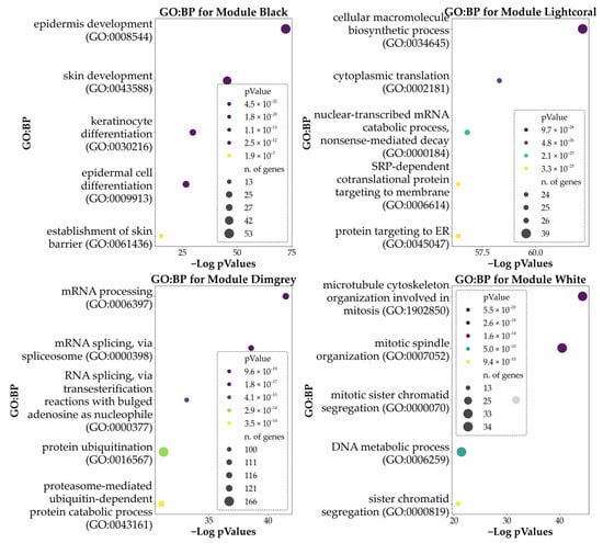 Similarly to DEA analyses, we used data from top modules to highlight the predominant GO characterizing the clusters. In particular, we found 31 BPs enriched in the Black Module, 348 BPs in the Dimgrey module, 169 BPs in the Lightcoral module, and 191 in the White module. No significant BPs were found for the Darksalmon module.