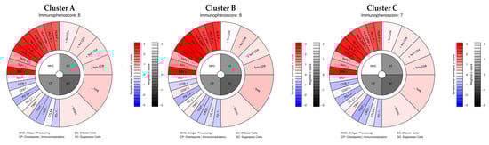 The modules were then tested for correlation with the clusters previously identified. A cluster-associated module may suggest a co-expressed gene network that is systematically linked to the subtype, providing further information about its underlying biological mechanism. Among the modules, the Lightcoral, White, Dimgrey, Darksalmon, and Black modules showed a significant correlation with at least one of the clusters, using a restrictive p-value cut-off of p-value < 0.001 and a r value > 0.5. Of these modules, Lightcoral (Cluster A r = 0.29, Cluster B r = −0.64, Cluster C r = 0.34) and White (Cluster A r = 0.07, Cluster B r = −0.51, Cluster C r = 0.43) showed the highest positive correlation with Cluster C and the highest negative correlation with Cluster B; Dimgrey (Cluster A r = 0.44, Cluster B r = −0.61, Cluster C r = 0.17) showed the highest positive correlation with Cluster A and the highest negative correlation with Cluster B; Darksalmon (Cluster A r = −0.28, Cluster B r = 0.55, Cluster C r = −0.26) showed the highest positive correlation with Cluster B and a low-moderate negative correlation with Cluster A and C; and Black (Cluster A r = 0.26, Cluster B r = 0.47, Cluster C r = −0.70) showed the highest positive correlation with Cluster B and the highest negative correlation with Cluster C. Figure 5 reports the modules–clusters relationships.