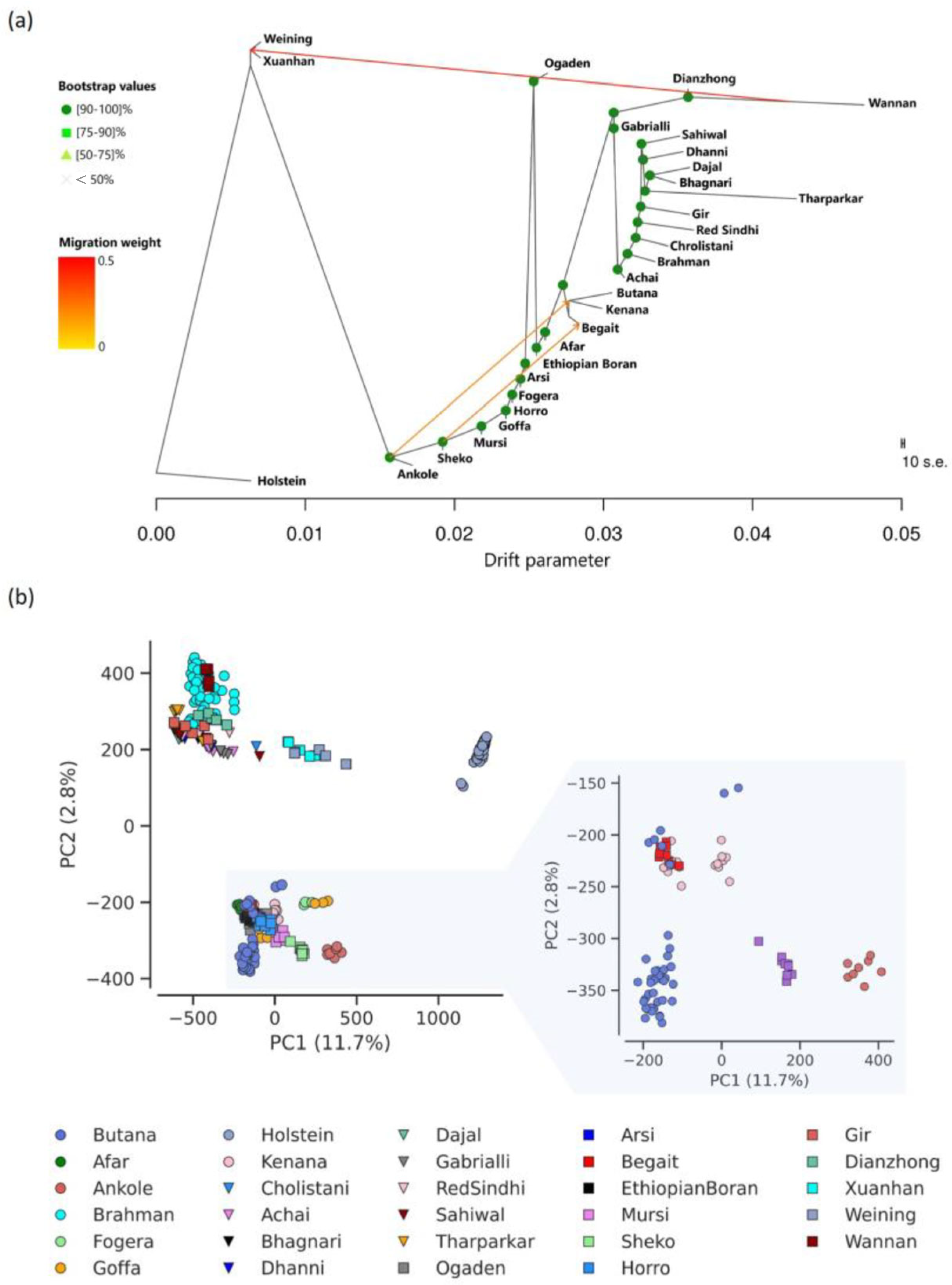 - Salim, B.; Taha, K.M.; Hanotte, O.; Mwacharo, J.M. Historical Demographic Profiles and Genetic Variation of the East African Butana and Kenana Indigenous Dairy Zebu Cattle. Anim. Genet. 2014, 45, 782–790. [Google Scholar] [CrossRef] [PubMed]