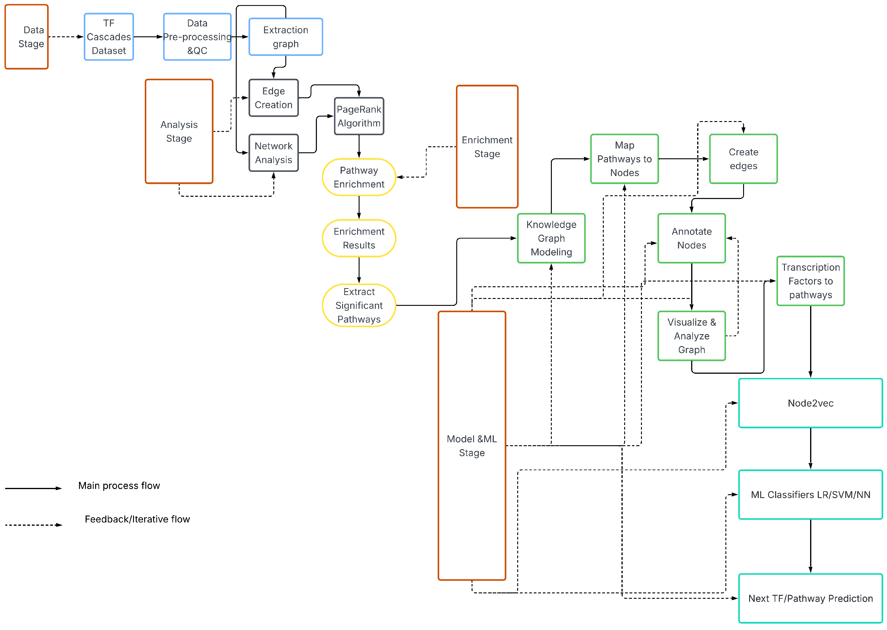 The process of preprocessing the TF interaction data was crucial to ensure that the data is accurate and reliable when building TF cascades. We removed duplicate TF interactions to eliminate any redundant information that existed in the dataset. Additionally, we formatted the data in a way that could be easily used for building the TF cascades; i.e., we organized the data so that it could be easily read and analyzed by the algorithms that were used to build the cascades.The Overall workflow is depicted on (