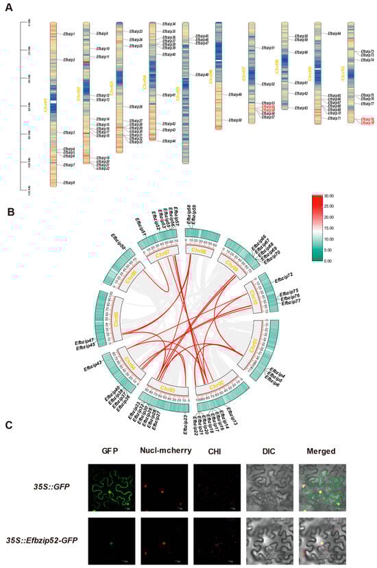 Chromosomal localization, intraspecific synteny, and subcellular localization analysis of Efbzip genes. (A) The chromosomal localization map of the Efbzip gene family members. (B) Intraspecific synteny analysis. (C) Subcellular localization of Efbzip52. The subcellular localization maps from left to right are GFP green fluorescent protein (GFP), nucleus marker (Nucl mcherry), chloroplast fluorescence channel (CHI), brightfield (DIC), and merged image. Gray lines indicate collinear genes within E. fulvus, while red highlights Efbzip collinear genes.