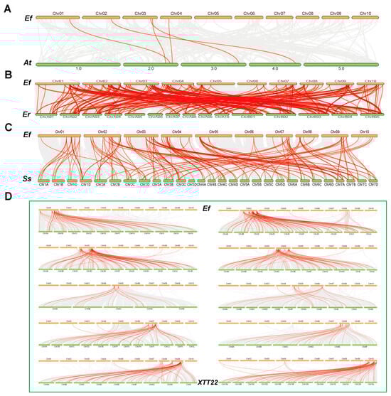 Interspecies collinearity analysis. (A) Collinearity analysis between Ef and At; (B) Collinearity analysis between Ef and Er; (C) Collinearity analysis between Ef and Ss; (D) Collinearity analysis between Ef and Ss. The gray line represents the collinearity genes between E. fulvus and other species, while the red line highlights the collinearity genes between E. fulvus Efbzip and other species.