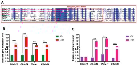 Analysis of transient expression impacts of Efbzip genes on sucrose metabolism. (A) Protein sequence alignment. (B) Quantification of gene expression. (C) Determination of sucrose content. Statistical significance was set as follows: **** p < 0.0001. Error bar: SD.