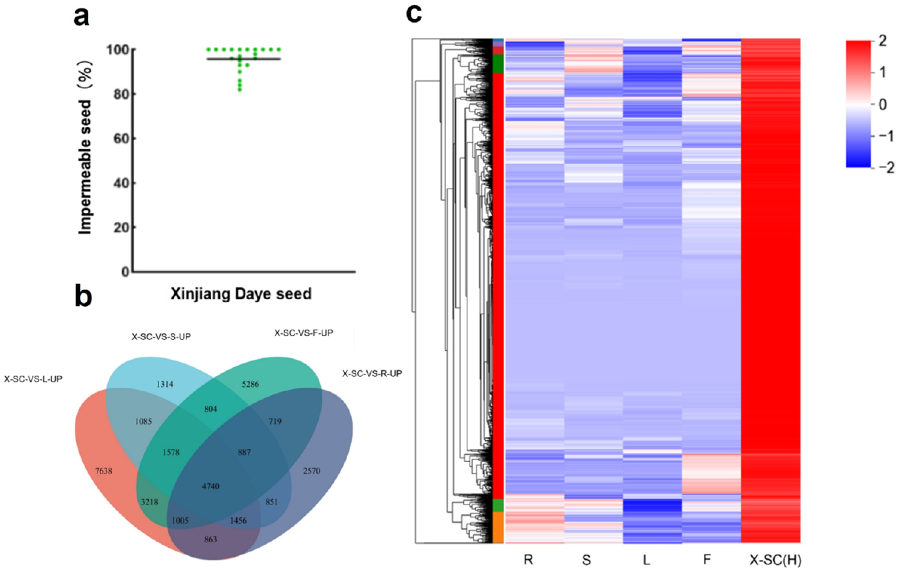 Figure 1. Screening the genes with higher expressions in the seed coat of Xinjiang Daye plants. (a) Green dots represent the impermeable seeds from each individual plant, and the horizontal line represents the overall average impermeable seed level of Xinjiang Daye. (b) Venn diagram analysis of differentially upregulated genes in Xinjiang Daye seed coat compared with other tissues (DEGs criteria log2 FC ≥ 2). (c) Heat map of specifically expressed genes in Xinjiang Daye seed coat (R, root; S, stem; L, leaf; F, flower; SC, seed coat).