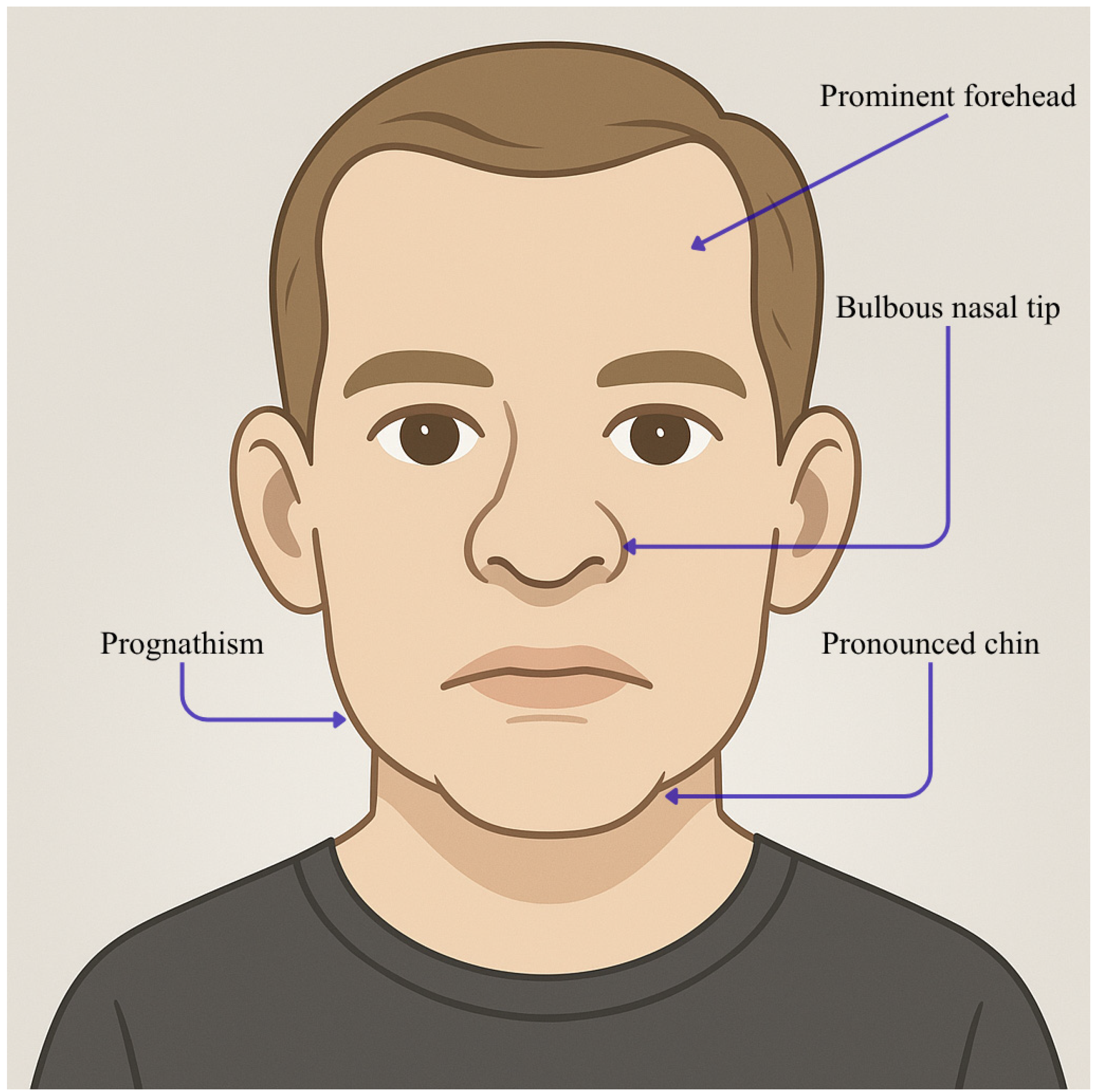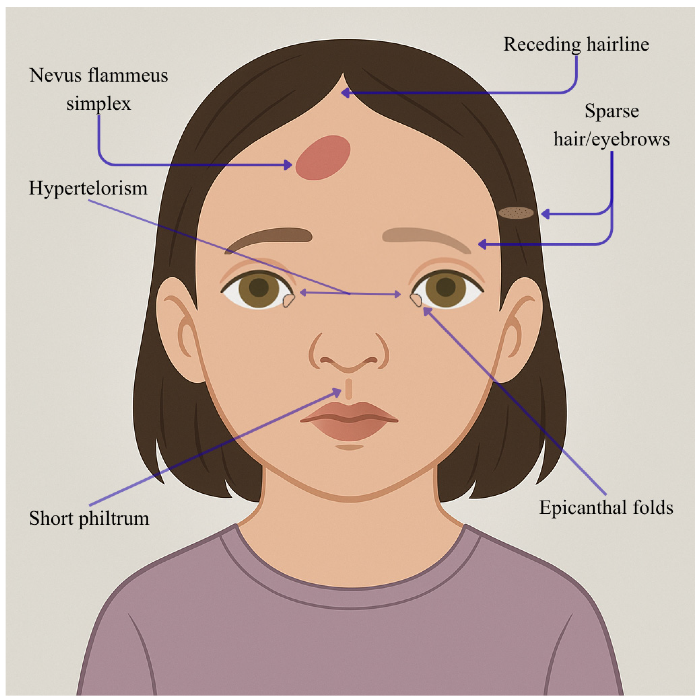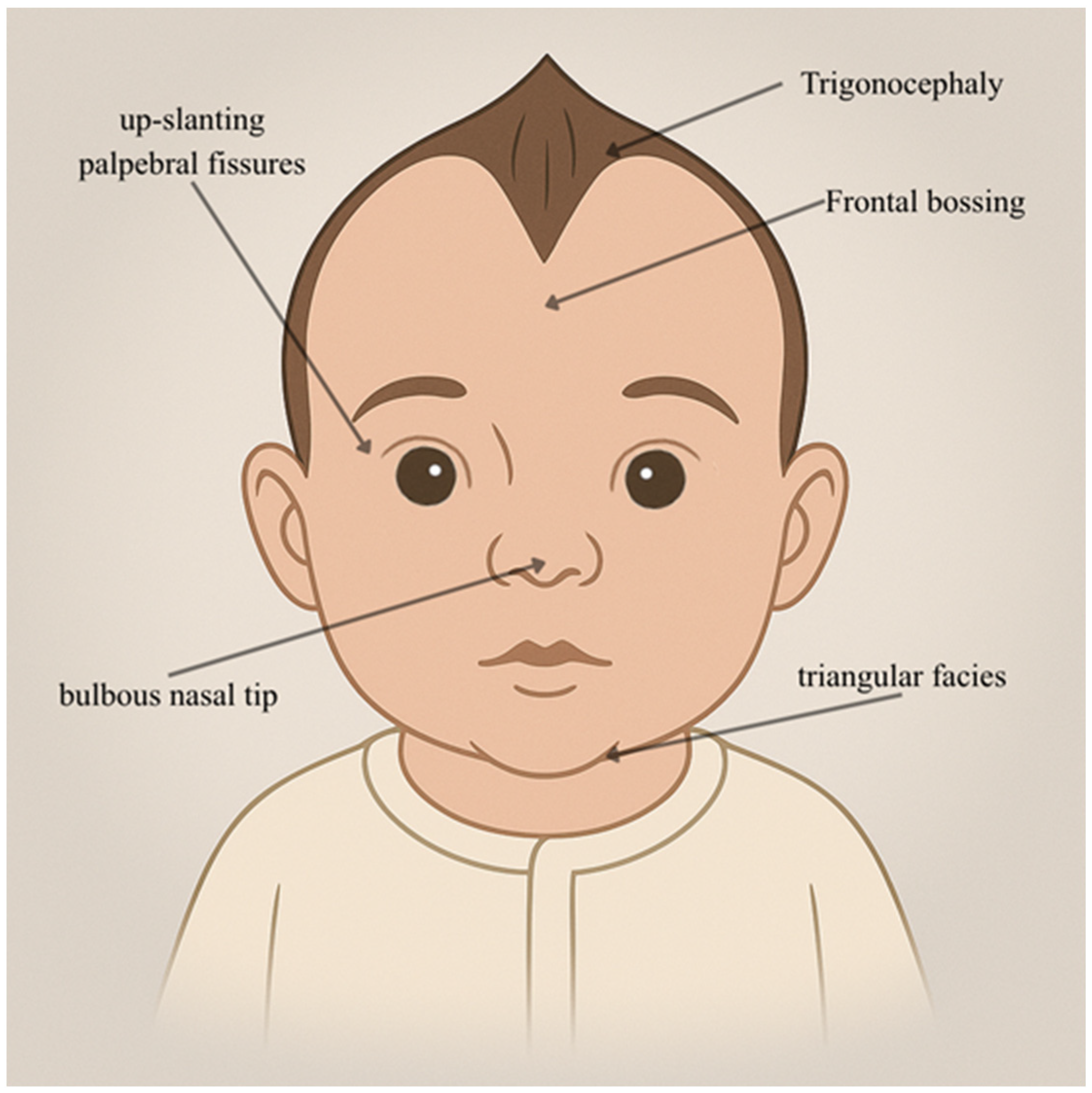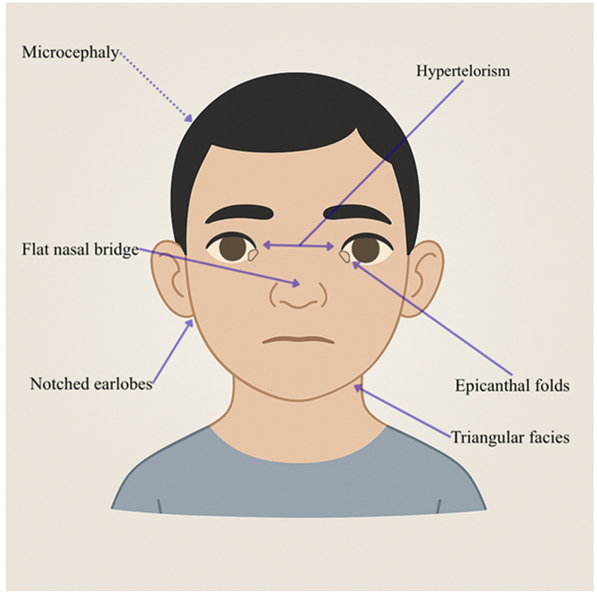 | Physical Anomalies | Microcephaly, slightly triangular face, flattened nasal bridge, bilateral epicanthic folds, bilateral nicked/crenelated ear lobes, pectus excavatum, partially fused fingers | Similar to Patient 1, but more sociable | Hypertelorism, bilateral cleft of ear lobes, pectus excavatum |