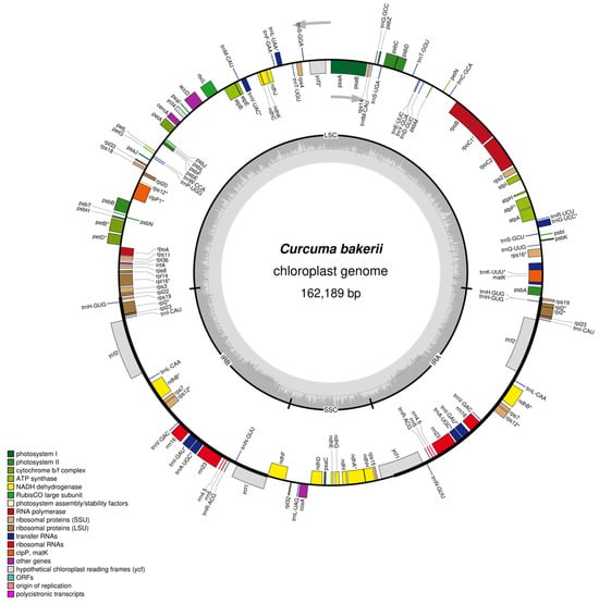 Circular representation of the C. bakerii cp genome. Genes located on the middle circle are recorded in the clockwise path, whereas individuals on the outward circle are recorded anti counterclockwise and innerward circle are clockwise direction. The dark grey ring illustrates the guanine–cytosine (GC) content, while the light grey ring designates the adenine–thymine (AT) content.