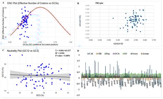 MEGA12 was operated to determine the GC percentage of the screened coding sequences [38], while the first three spots of GC content three spots of the codons (GC1, GC2 and GC3, respectively) were determined with the CUSP applications within the EMBOSS explorer [39]. The proportion of the real codon usage of a codon in the gene under scrutiny to that projected for all codons in the gene is known as the relative synonymous codon usage (RSCU) value [40]. In addition, codon usage indices T3S, C3S, A3S, and G3S, which indicate nucleotide frequency at the third position of synonymous codons, as well as RSCU, effective number of codons (ENC) and Codon Adaptation Index (CAI), were analysed under CodonW v1.4.2 [41]. The pattern of synonymous codon usage is often evaluated to judge the influence of mutational bias and natural selection by using the reasoning that there is a relationship between the Parity Rule 2 plot and the distribution of the four bases in the third codon location of a gene. GC12 denotes the mean value of GC1 and GC2. A zero slope in the regression indicates that directional mutation pressure does not exist; for example, the codon usage pattern is due to selection pressure rather than mutational pressure. However, a slope of 1 indicates that mutational pressure affects GC12 and GC3 equally across codon positions. R software (version 3.6.3) was used [42]. Optimal codons were revealed using the ΔRSCU approach, where ΔRSCU denotes the diversity in RSCU values between highly and lowly expressed genes. A codon can be considered ideal when the ΔRSCU value is >0.08 and the resolved RSCU value in either the high- or low-expression dataset exceeds 1.