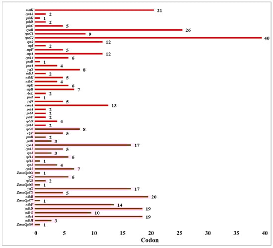 The PREPACT web database was used to identify C-to-U RNA editing locations in the C. bakerii cp genome. In total, 55 RNA editing locations were detected, allotted across 50 protein-coding and 5 non-coding genes (Table S4). Among these, the rpoC2 gene had the most editing sites (40), followed by rpoB with 26. The matK gene had 21 sites, and the ndhB gene had 20 sites. On the other hand, the ndhD and ndhA genes each had 19 RNA editing sites (Figure 5). In addition, rpoA and ycf2 both had 17 editing sites. In addition, some genes had 10–14 editing sites (ndhG, cemA, atpA, rps2, and ndhF), whereas the remaining genes had fewer than 10. The evidence indicates that RNA editing is not random, as it is marked by enrichment in transcription and energy metabolism genes. This suggests that it is vital for maintaining the functional proteins within the plastid.