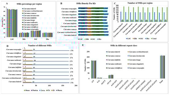 Comparison of simple sequence repeats (SSRs) among the cp genomes of ten Curcuma species. (A) Percentage allocation of SSRs across different genomic regions. (B) Frequency of SSRs density per kilobase (kb) in the LSC, SSC, and IR regions. (C) Number of SSR loci per region identified across species. (D) Number of different SSRs in the species (E) Frequency of SSRs categorised by repeat motif classes.