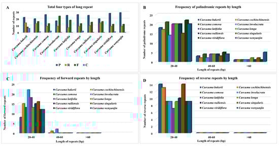Analysis of long repeat sequences in the cp genomes of ten Curcuma plants. (A) Distribution of four repeat types: P (palindromic), R (reverse), F (forward), and C (complement). (B) Frequency of palindromic repeats by length. (C) Frequency of forward repeats by length. (D) Frequency of reverse repeats by length.