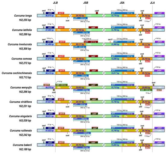 Comparison of junction boundaries among the LSC, SSC, and IR regions in the cp genomes of nine Curcuma species and C. bakerii. Distinctly coloured blocks represent complete or partial genes located adjacent to the junctions.