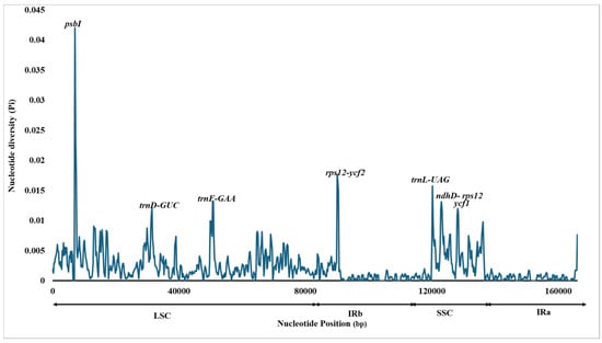 Additionally, sequence divergence hotspots were identified by calculating nucleotide diversity (Pi) within 800 bp windows (Table S4). The results showed that the nucleotide diversity (Pi) across the chloroplast genomes of Curcuma species ranged from 0 to 0.041. Seven highly variable areas (Pi > 0.01) were detected: psbI, trnD-GUC, trnF-GAA, rps12-ycf2, trnL-UAG, ndhD-rps12, and ycf1. Among these, in the LSC region, three hotspots, psbI, trnD-GUC, and trnF-GAA, were identified, whereas in one region, rps12-ycf2 was found in IRb. The three regions, trnl-UAG, ndhD-rps12, and ycf1, were in the SSC region (Figure 10). Therefore, the comparative patterns indicate that while the Curcuma plastomes are broadly conserved, a small number of highly variable regions distributed across the LSC, SSC, and IR boundary areas offer valuable markers for distinguishing species and for interpreting evolutionary divergence within the genus.