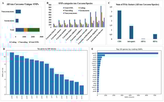 SNPs with hypervariable regions of C. bakerii and nine other Curcuma species. (A) Unique Synonymous and Nonsynonymous SNPs, (B) Total SNPs (Coding, Noncoding, Synonymous, Nonsynonymous), (C) Sum of Pi by feature, (D) Top genes by SNPs density, (E) Top 20 genes by coding SNPs.