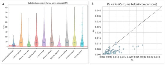 Scientists studied synonymous (Ks) and non-synonymous (Ka) substitution rates in C. bakerii to examine its molecular evolutionary dynamics relative to nine Curcuma species aligned. Using DnaSP v6, single-nucleotide polymorphisms (SNPs) were found from sequence alignments at variable sites, excluding alignment gaps [47,48]. Subsequently, the Ka/Ks ratios of each gene were calculated using the KaKs_Calculator v2.0 with the Yang–Nielsen method [49].