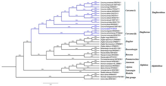 A maximum-likelihood (ML) phylogenetic tree was constructed from cp genome sequences of 36 species. The numerical values displayed beside each branch indicate the bootstrap support scores. The blue color indicate curcuma.