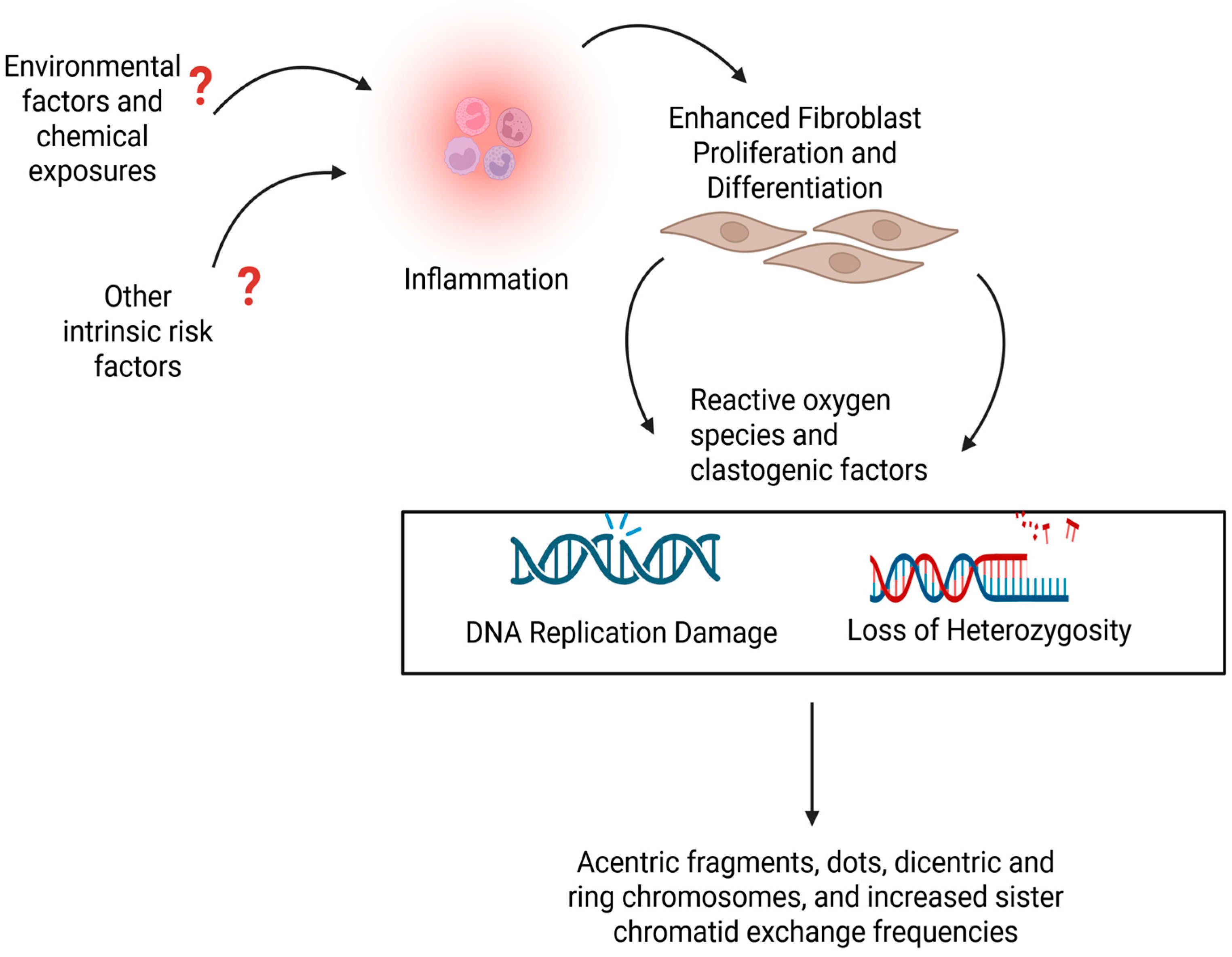 | Bleomycin | Skin and lung fibrosis | Double-strand breaks, translocations, deletions, and dicentric chromosomes | [102,103,104,105,106] |