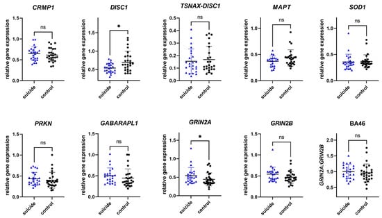 Relative gene expression of candidate genes in Brodmann area 46. Data are presented in scatter plots with mean and SD, with each point as a measure of relative gene expression per subject. Tests used are Mann–Whitey U test or Student t-test. Abbreviations: ns—not statistically significant; p-value > 0.05; *—p-value ≤ 0.05.