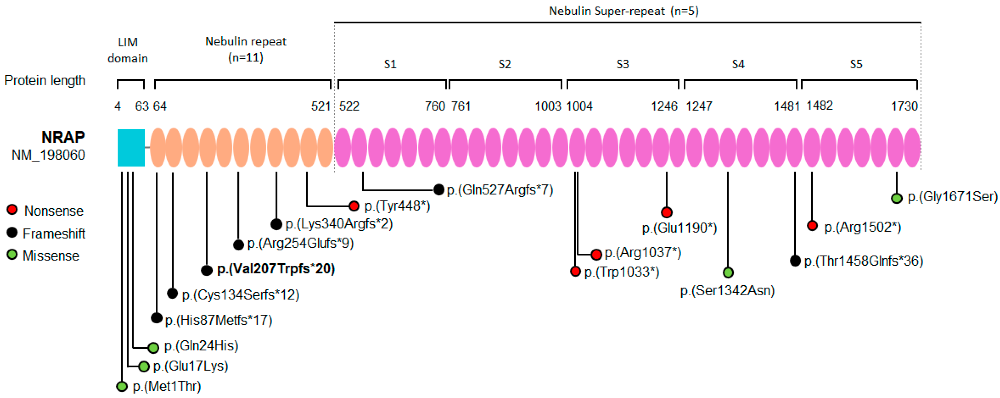- Truszkowska, G.T.; Bilinska, Z.T.; Muchowicz, A.; Pollak, A.; Biernacka, A.; Kozar-Kaminska, K.; Stawinski, P.; Gasperowicz, P.; Kosinska, J.; Zielinski, T.; et al. Homozygous truncating mutation in NRAP gene identified by whole exome sequencing in a patient with dilated cardiomyopathy. Sci. Rep. 2017, 7, 3362. [Google Scholar] [CrossRef]