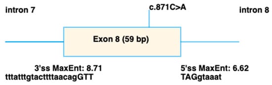 Figure 6. Schematic showing the splicing defect predicted to be caused by the c.871C>A p.(Arg291Ser) variant in IMPG2, using spliceAI visual [34].