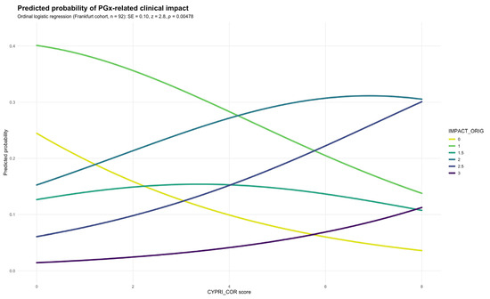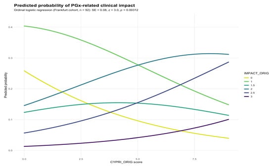 To evaluate the performance of the original CYPRI scoring system, we examined the association between the total CYPRI score and the clinical outcome (IMPACT) in the Frankfurt sample (n = 92). Ordinal logistic regression revealed a statistically significant association between higher CYPRI scores and greater PGx-related clinical impact (SE = 0.08, p = 0.00312; Figure 1). This suggests that an increasing CYPRI score is associated with a higher likelihood of a clinically meaningful impact on medication (e.g., medication adjustment or increased monitoring).