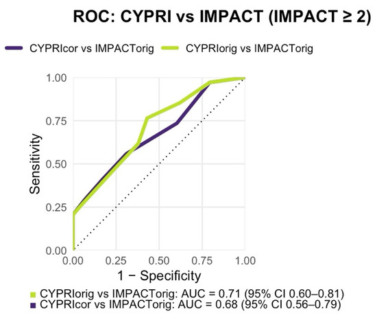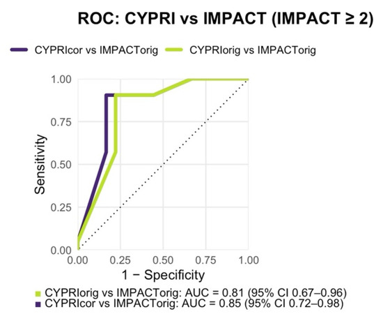 Receiver Operating Characteristic (ROC) analysis comparing CYPRI_orig vs. IMPACT_orig (AUC = 0.81, 95% CI 0.67–0.96) and CYPRI_cor vs. IMPACT_orig (AUC = 0.85, 95% CI 0.72–0.98) in the Prague cohort (n = 39).