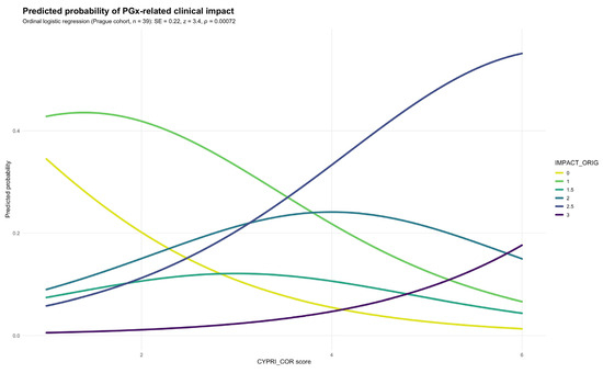 To evaluate the predictive performance of the CYPRI and IMPACT scoring systems, a multistep statistical analysis was conducted. Given the ordinal nature of the outcome variable (IMPACT score), ordinal logistic regression was applied to assess the association between total CYPRI scores and the likelihood of pharmacogenetically driven clinical interventions. The model’s assumptions, including the proportional odds assumption, were verified prior to interpretation.