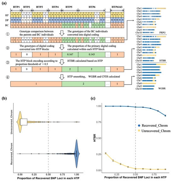 An HTP block was classified as recovered (coded as 1) if its proportion of recurrent SNPs exceeded the threshold and as unrecovered (coded as 2) otherwise. The HTP-based recurrent parent background recovery rate (HTBR) was then calculated as follows:
