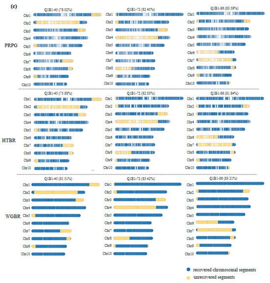 To evaluate the breeding utility of our method, we analyzed the genetic background of the top three lines with the highest BRR (Figure 3c). While their overall BRR values were comparable, their genomic structures differed markedly. Line Q1B1-86 (highest BRR) harbored numerous small donor fragments, whereas Q1B1-72 featured more fully recovered chromosomal arms.