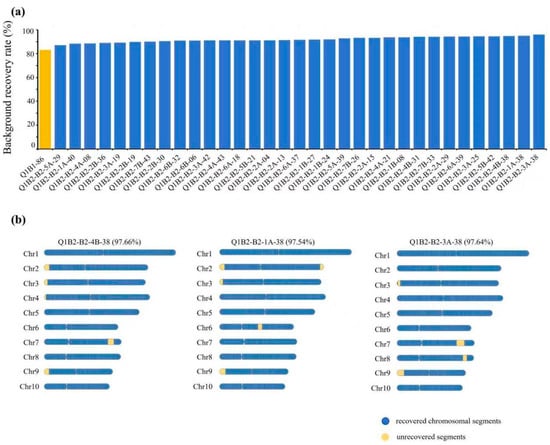 To evaluate the performance of the G2H strategy in advanced generations, we analyzed a BC2 population derived from the BC1 individual Q1B1-86. As shown in Figure 4a, the BRR of the Q1B2 population ranged from 87.09% to 97.64%, with 81.8% (27/33) of individuals exceeding 90% recovery, demonstrating effective genetic background purification through G2H-guided selection.