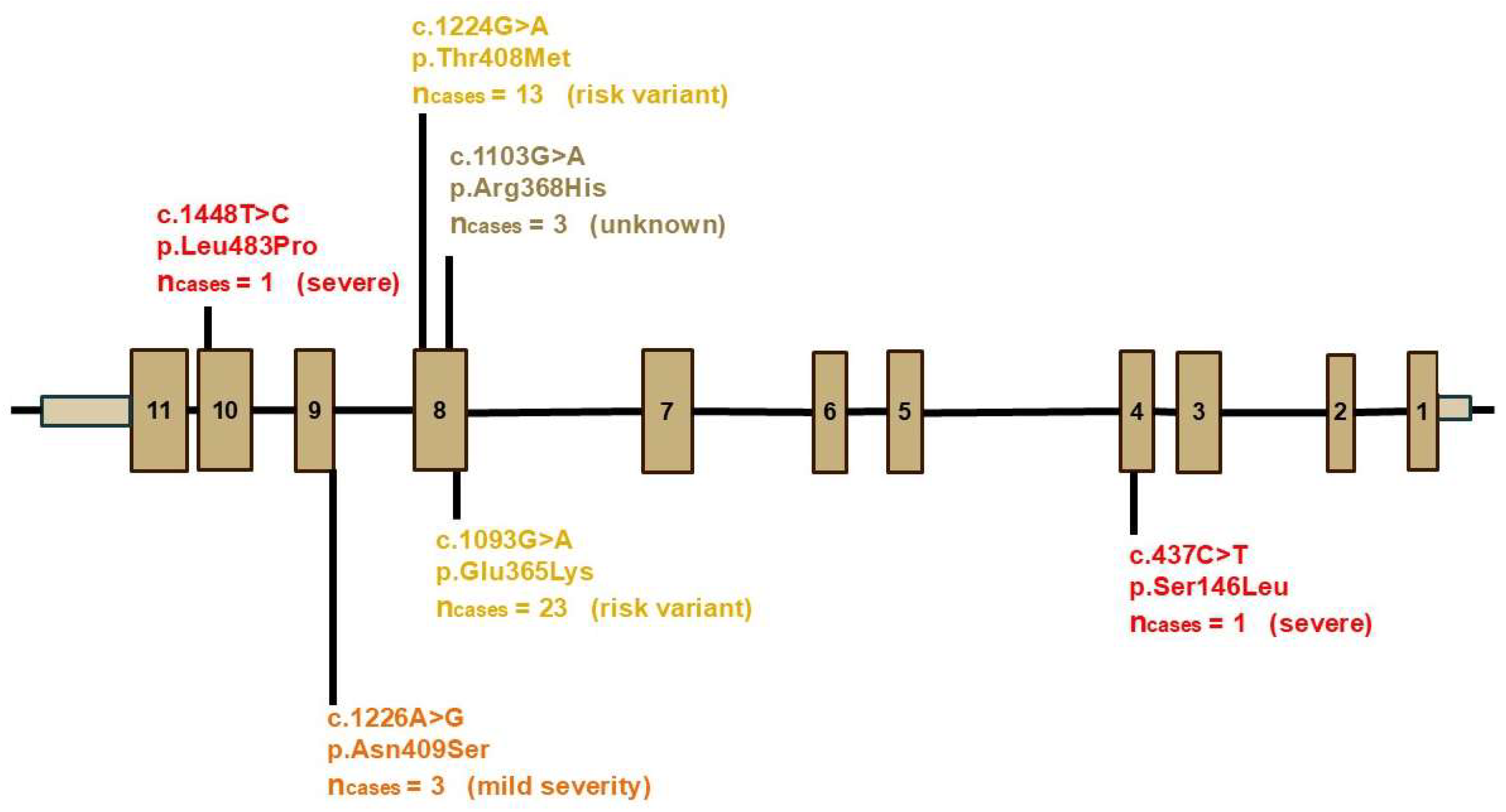 - Ran, C.; Brodin, L.; Gellhaar, S.; Westerlund, M.; Fardell, C.; Nissbrandt, H.; Soderkvist, P.; Sydow, O.; Markaki, I.; Hertz, E.; et al. Glucocerebrosidase variant T369M is not a risk factor for Parkinson’s disease in Sweden. Neurosci. Lett. 2022, 784, 136767. [Google Scholar] [CrossRef]