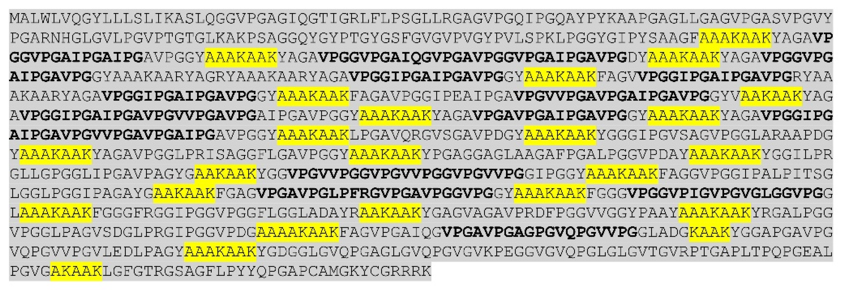 - Miao, M.; Sitarz, E.; Bellingham, C.M.; Won, E.; Muiznieks, L.D.; Keeley, F.W. Sequence and domain arrangements influence mechanical properties of elastin-like polymeric elastomers. Biopolym. Orig. Res. Biomol. 2013, 99, 392–407. [Google Scholar] [CrossRef] [PubMed]