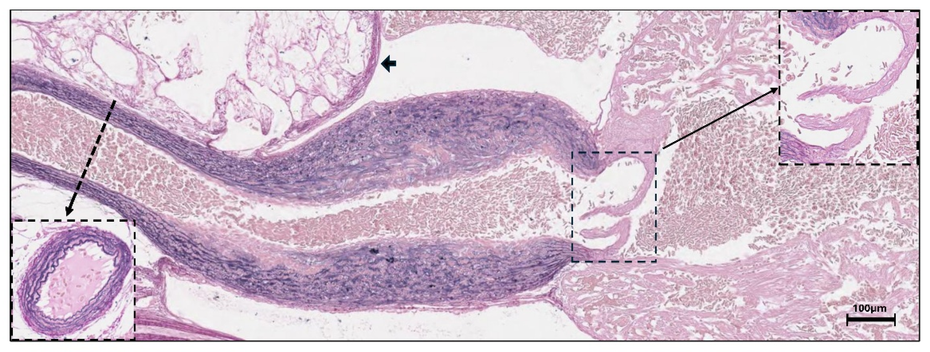 - Benjamin, M.; Norman, D.; Santer, R.; Scarborough, D. Histological, histochemical and ultrastructural studies on the bulbus arteriosus of the sticklebacks, Gasterosteus aculeatus and Pungitius pungitius (Pisces: Teleostei). J. Zool. 1983, 200, 325–346. [Google Scholar] [CrossRef]