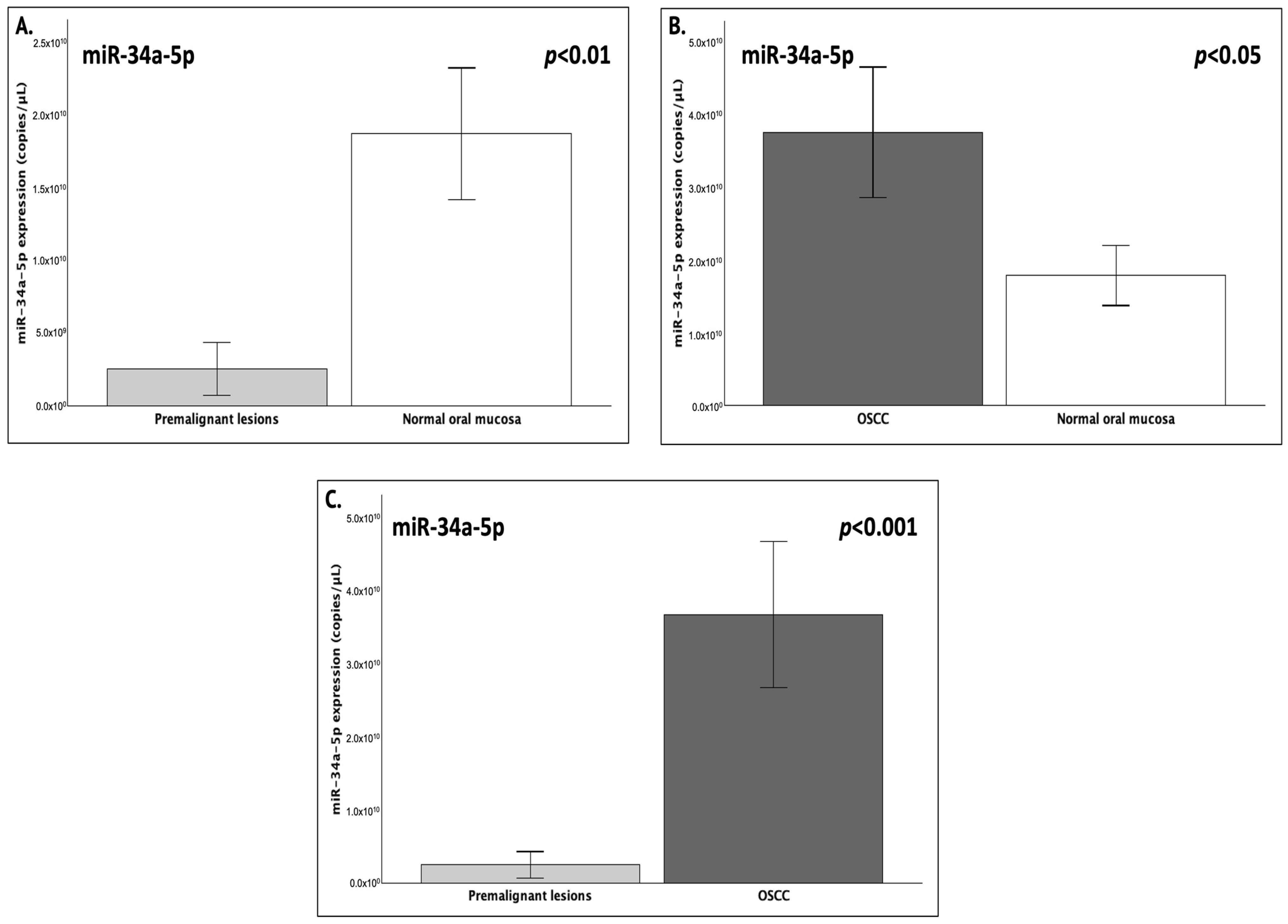 In the present study, building upon our previous bioinformatic research, we aimed to experimentally investigate the putative stage-specific role of miR-34a-5p in oral oncogenesis through the quantification of its expression in the salivary samples of three groups, corresponding to key histopathological stages of malignant progression. This included patients with premalignant dysplastic oral lesions, patients with OSCC and gender- and age-matched controls with clinically normal oral mucosa. The definition of the premalignant group was based exclusively on the presence of dysplastic regions was intentional, as dysplasia represents the bridge stage towards malignant transformation. Additionally, the fact that dysplastic and inflammatory areas are known to coexist in both dysplastic and OSCC lesions ensured that any observed differential expression of miR-34a between the premalignant and OSCC groups would indeed reflect state-dependent effects, rather than incidental inter-lesional variability.