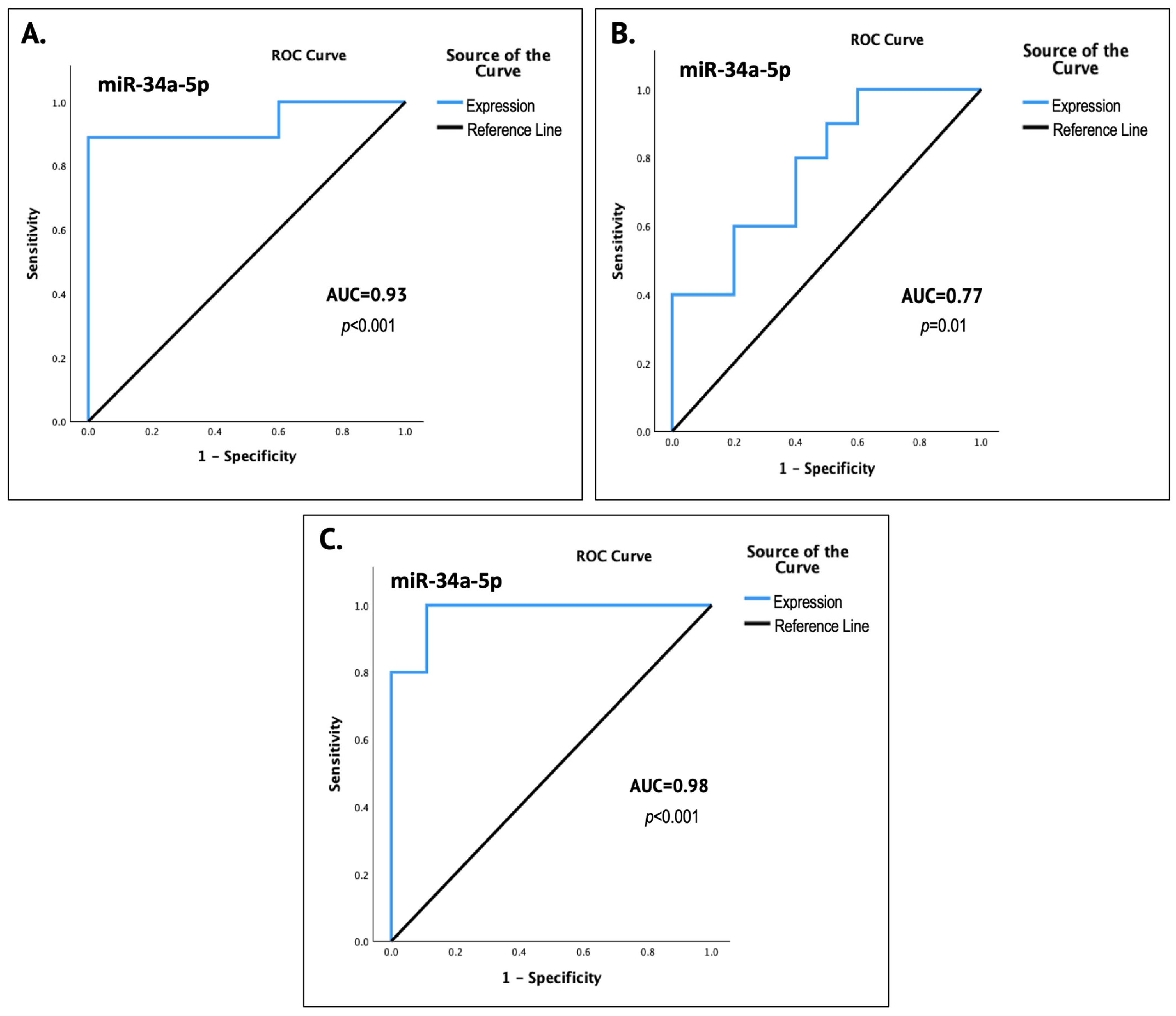 Individual Receiver Operating Characteristic (ROC) analyses were performed for each pair of study groups in order to evaluate the diagnostic accuracy of salivary miR-34a-5p in detecting each pathological state and distinguishing it from normal oral epithelium, as well as in discriminating between OSCC and premalignant dysplastic lesions. For each analysis, the corresponding ROC curve was generated, followed by the calculation of the Area under the Curve (AUC) and the respective p value, indicating the diagnostic performance of the potential biomarker. The level of statistical significance was set at p < 0.05 (two-tailed).
