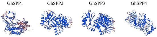 Structural modeling and analysis of the GhSPP protein sequence using the Swiss-model and SOPMA online tools (Figure 1, Table 2). The results indicate that all four GhSPP proteins contain fundamental secondary structural elements such as alpha helix, extended strand, random coils, and beta turn, though the proportions of these elements vary significantly among them. From a structural perspective, the GhSPP proteins primarily consist of random coil and alpha helix, which together account for over 70% of its spatial structure. Extended strands constitute the next largest proportion, while beta turn represents the smallest fraction, accounting for less than 10% in all four GhSPP proteins. This indicates that GhSPP proteins exhibit high overall flexibility and dynamicity.