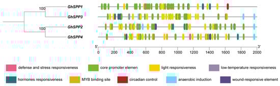 Promoter regions (upstream 2000 bp) of the SPP gene family members were extracted from the whole genome sequence of hirsutum. The types, quantities, and functions of cis-acting elements were analyzed using the PlantCARE database (https://bioinformatics.psb.ugent.be/webtools/plantcare/html/, accessed on 11 December 2025) [22].