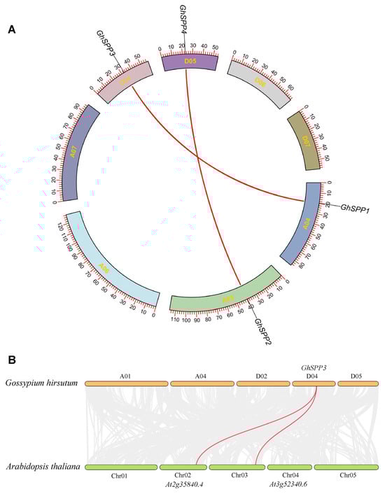 Genetic collinearity analysis of the GhSPP Family. (A) Collinearity analysis of SPP genes in hirsutum. (B) Collinearity analysis between G. hirsutum GhSPP genes and Arabidopsis thaliana genes.