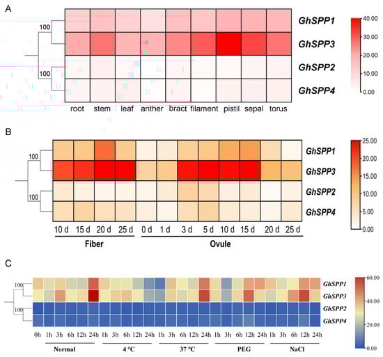 RNA-seq data obtained from the CottonMD database (https://yanglab.hzau.edu.cn/CottonMD, accessed on 11 December 2025) for different tissues (root, stem, leaf, anther, bract, filament, pistil, sepal, torus, post-flowering fiber at different time points, and ovule) and abiotic stress treatments (low temperature, high temperature, salt, drought). Using FPKM as the expression metric, TBtools software was employed to generate a heatmap of SPP gene expression patterns across cotton.