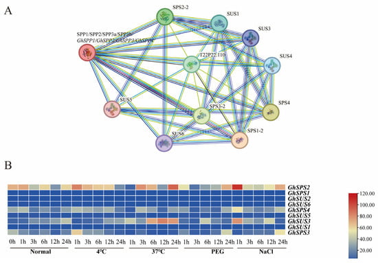 To investigate the interaction network of GhSPP proteins in hirsutum, this study first constructed the protein interaction network of GhSPP proteins using the online tool from the STRING database (STRING: functional protein association networks). Furthermore, based on the CottonMD database (https://yanglab.hzau.edu.cn/CottonMD, accessed on 11 December 2025), we obtained expression data for the genes encoding proteins interacting with GhSPP in the hirsutum standard line TM-1. These data were derived from RNA-seq sequencing results under various abiotic stress treatments (low temperature, high temperature, salt, drought) and normalized using FPKM values to characterize expression levels. Finally, using FPKM as the gene expression metric, TBtools software was employed to generate heatmaps depicting the expression patterns of these interacting protein-encoding genes under multiple stress conditions.