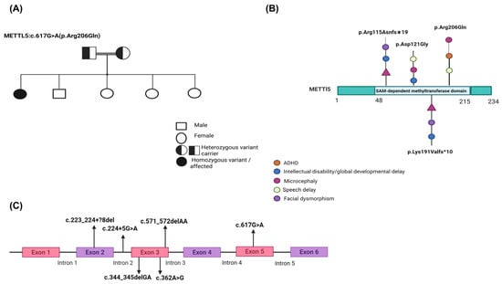 Clinical and genomic overview of the METTL5 variant identified in this study. (A) Gene structure of METTL5 with exon-intron boundaries and variant positions. The METTL5 gene comprises six exons. Variants from previously reported cases and the current study are shown with their positions and HGVS nomenclature. The novel c.617G > A variant falls within exon 5. Other mutations shown include splice site variants (e.g., c.224 + 5G > A), frameshift deletions (e.g., c.344_345delGA, c.571_572delAA), and a missense variant (c.362A > G). (B) Schematic representation of the METTL5 protein and associated pathogenic variants. Previously reported METTL5 variants are mapped along the protein, including frameshift (p.Arg115Asnfs19, p.Lys191Valfs10), missense (p.Asp121Gly), and splice-site variants. The novel p.Arg206Gln variant identified in our patient is located in the C-terminal region of the SAM-dependent methyltransferase domain (residues 48–215). Phenotypic features associated with each variant are represented using color-coded symbols: ADHD (orange), intellectual disability/developmental delay (blue), microcephaly (purple), speech delay (green), and facial dysmorphism (violet). (C) Pedigree of the affected family showing autosomal recessive inheritance. The proband (filled circle) is homozygous for the METTL5 c.617G > A (p.Arg206Gln) variant. The parents are first cousins and both heterozygous carriers (half-filled symbols), consistent with autosomal recessive inheritance. One male sibling has a history of speech delay and mild learning difficulties.