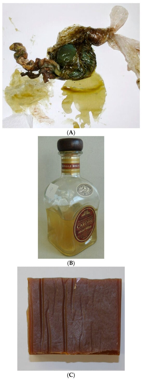 (A) Bile duct from Pantera tigris. (B) “Tiger bone wine” where the presence of P. tigris biological material was confirmed by DNA analysis. (C) An example of a “Bouillon cube” made from bones.
